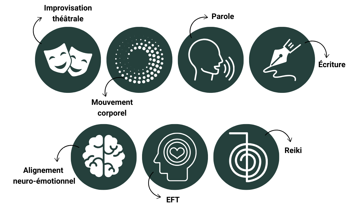 Ils offrent des accès direct aux émotions et à l’expression de soi en aidant à explorer les ressentis, utilisant le corps comme moyen d’expression. Nous travaillons sur la libération des peurs à la reconquête de la confiance en soi.